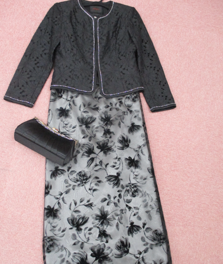 黒のジャケットにあわせて、花柄のワンピースで華やかに。
